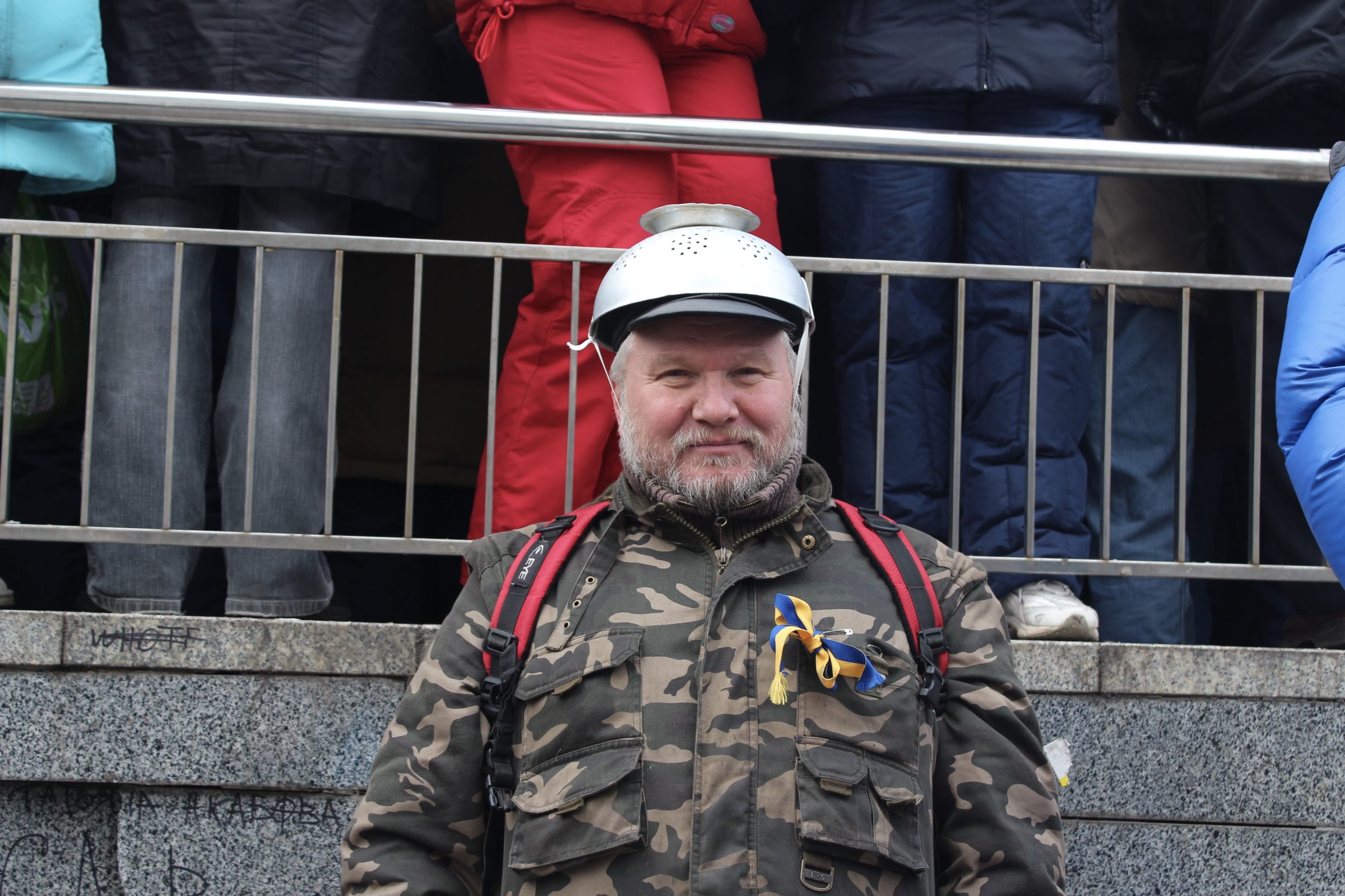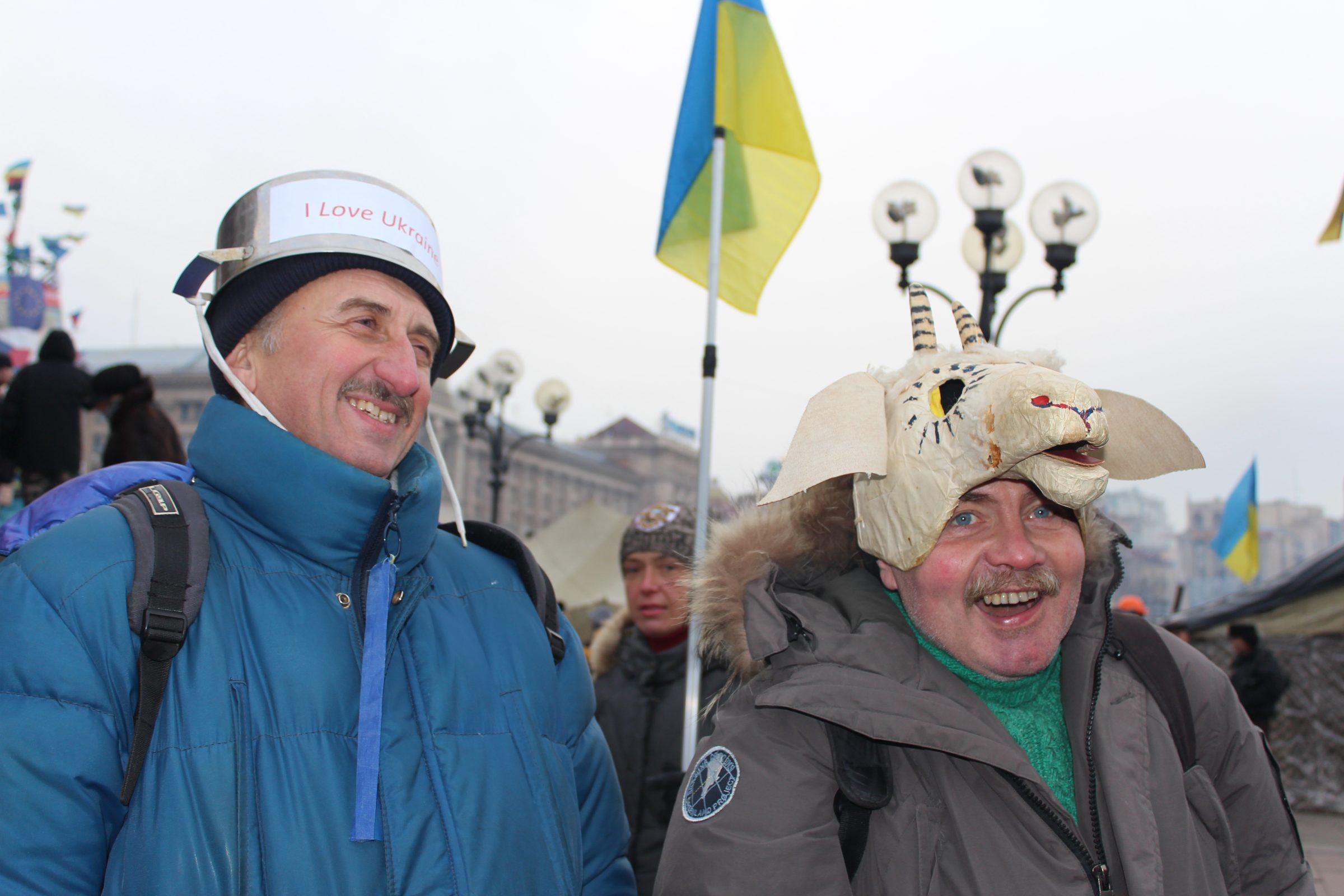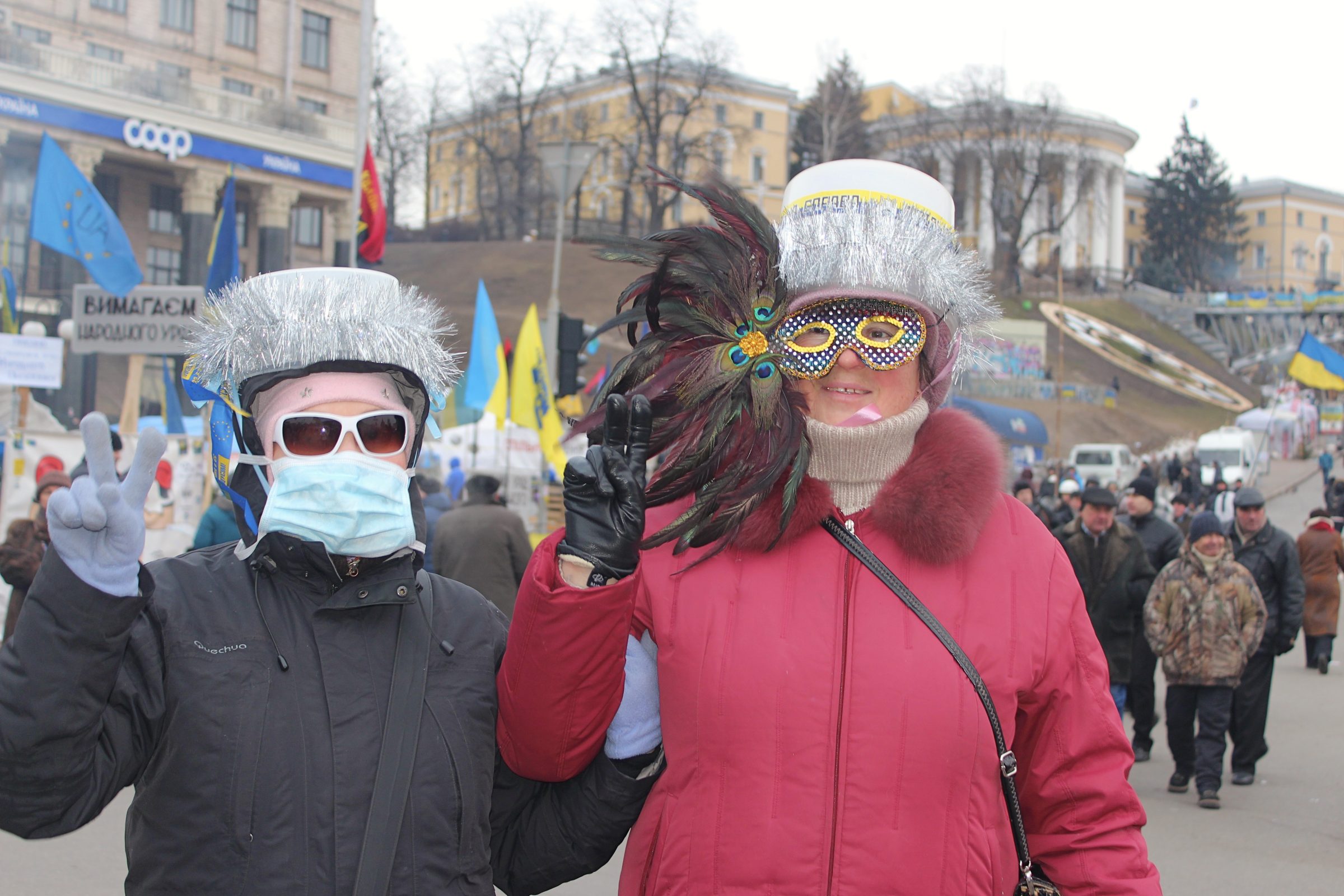 During the vote, Yanukovych’s Party of Regions locked opposition members of Parliament out of the legislative chamber and voted on each bill with a brief show of hands. Because of the voting method, the majority of Ukrainians were reluctant to give credence to the new laws. They continued to protest, despite the threats of jail terms and arbitrary arrest. Instead of trying to get around the laws, protesters made light of them. They blatantly disobeyed the prohibition against wearing construction helmets and face masks, donning anything they could find to break the law—including masquerade masks, funky hats, and even kitchen pots.