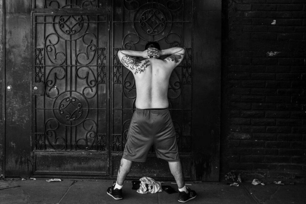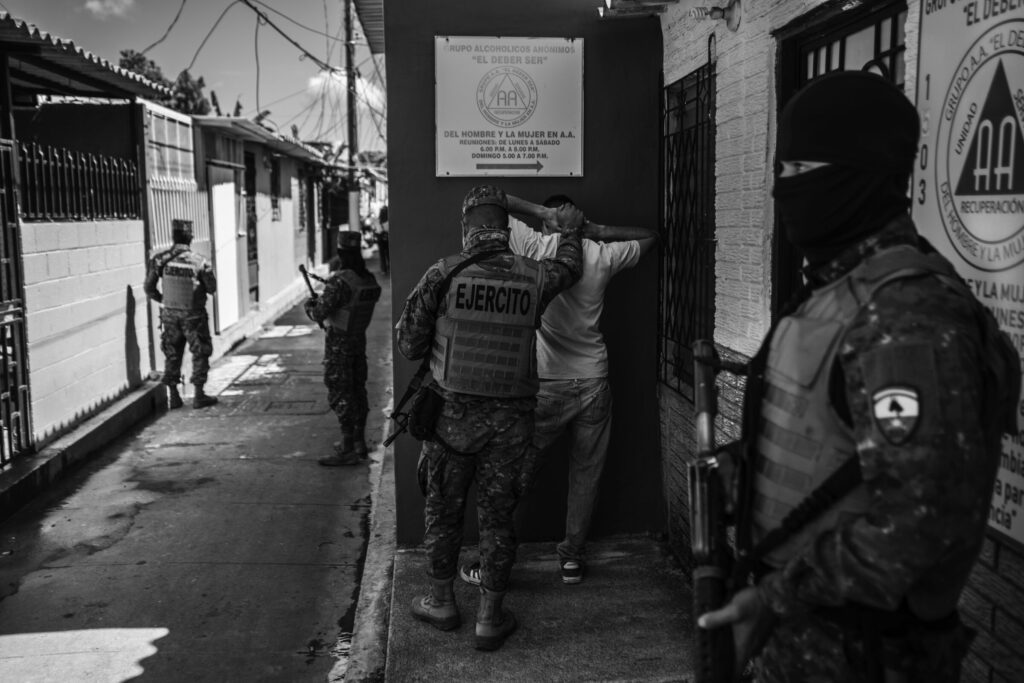 Barrera has reported consistently on the state of exception. “My main goal was to give a name and a face to those detained, those tortured, and those murdered.” One of the earliest photos he took captures this reality with brutal clarity: a shirtless man kneeling, surrounded by five soldiers, soon to be taken to jail. “The man is subdued; he can do nothing,” Barrera recalled. “He looks like prey that has surrendered and is about to be devoured.”