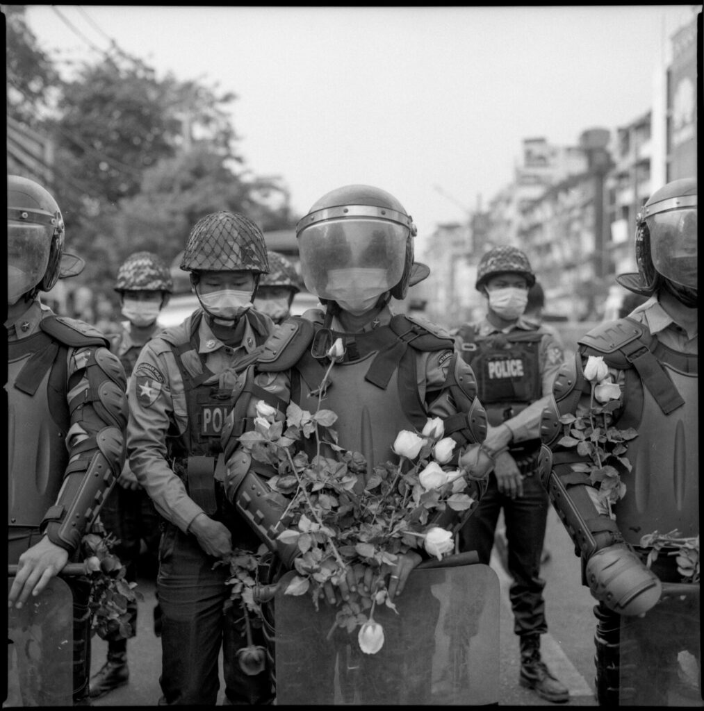 Riot police are seen with flowers as protesters gave during the anti-coup protest in Yangon, Myanmar on 6 February 2021. Caption and photo credit to independent photojournalist, Ta Mwe.