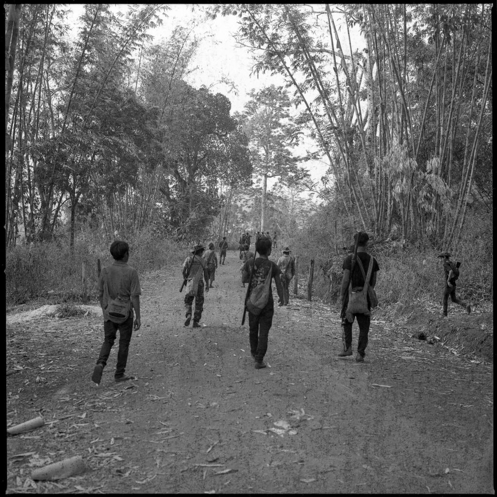 Villagers carrying homemade hunting rifles walk around the village as they came back from tactical training in Hpruso township, Myanmar on 22 March 2022. Many people around the Myanmar have joined ‘People’s Defense Armed Forces’ which was founded by National Unity Government (NUG) after the Spring Revolution to defend and protect lives from Myanmar military’s human rights violations and offensive attacks on the citizens. Caption and photo credit to independent photojournalist, Ta Mwe.