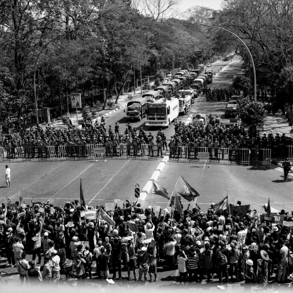 Thousands of pro-democracy protesters demand free all political leaders as police blocks the road during the anti-coup protest in Yangon, Myanmar on 9 February 2021. Caption and photo credit to independent photojournalist, Ta Mwe.